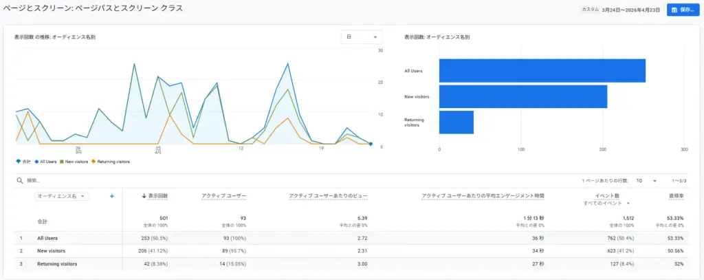 新規ユーザーの直帰率は全体平均を下回る50.56%と良好で、リピーターも14名(1人3ページ回遊)へと着実に伸長しました。技術記事からプロフィールへの遷移も19回発生しており、専門性と人柄の両面で「会う前からの信頼構築」が着実に進んでいます。